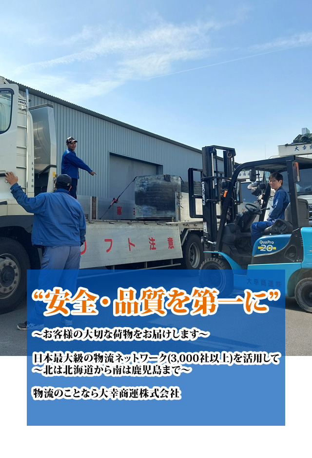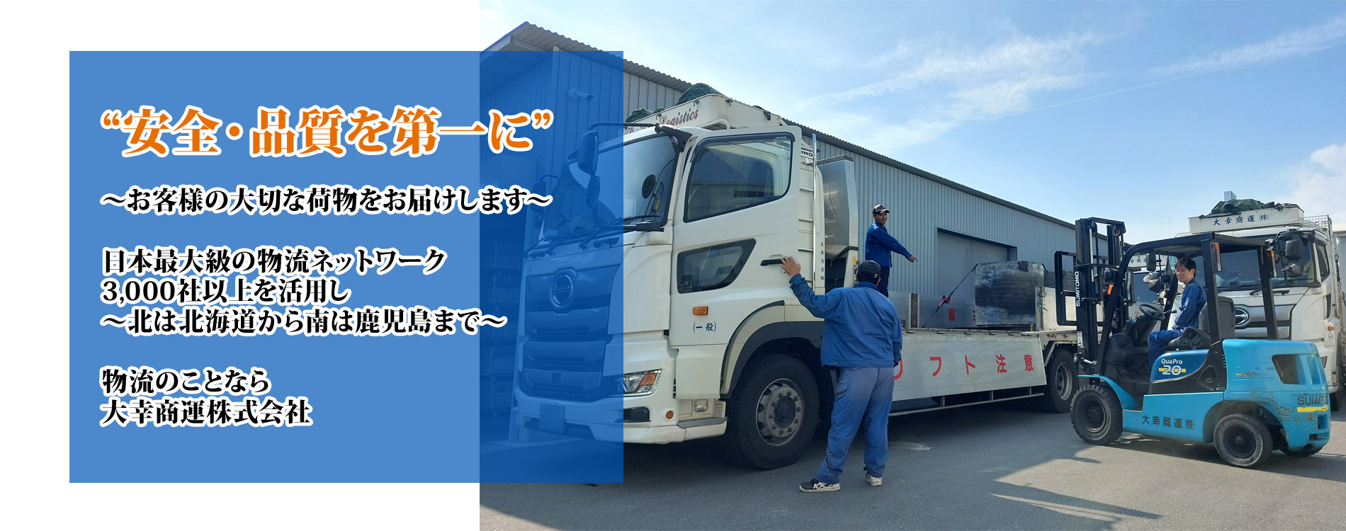 この度は、大幸商運株式会社のホームページにお越しいただき、誠にありがとうございます。大幸商運株式会社は、大阪を拠点に長年にわたり運送業に携わってきました。私たちは"輸送品質"に絶対の自信を持っています。
