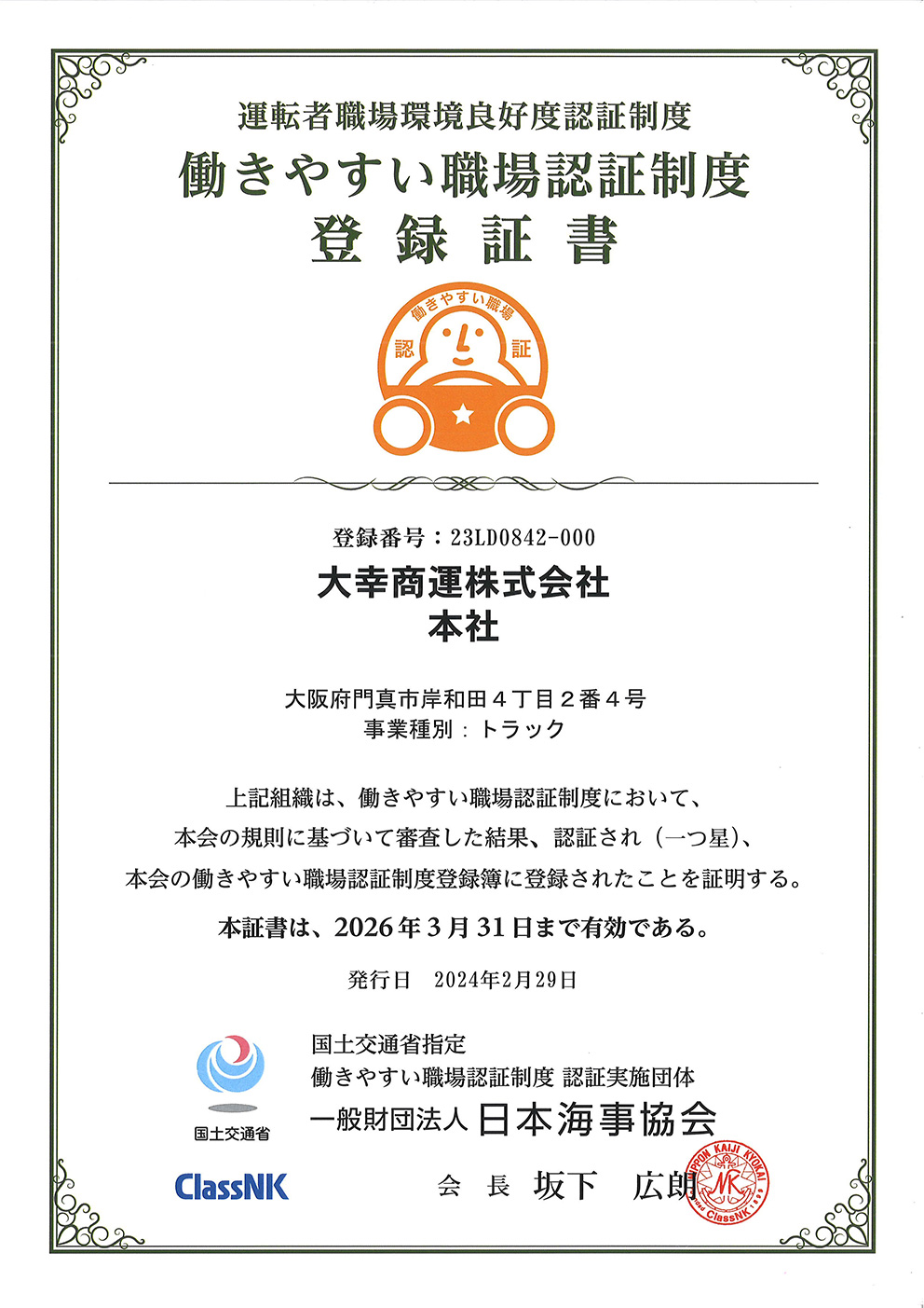 大幸商運株式会社は、国土交通省が推進する「働きやすい職場認証制度」において★1認証を取得。職場環境の改善や労働条件の向上に真剣に取り組んでいます。
