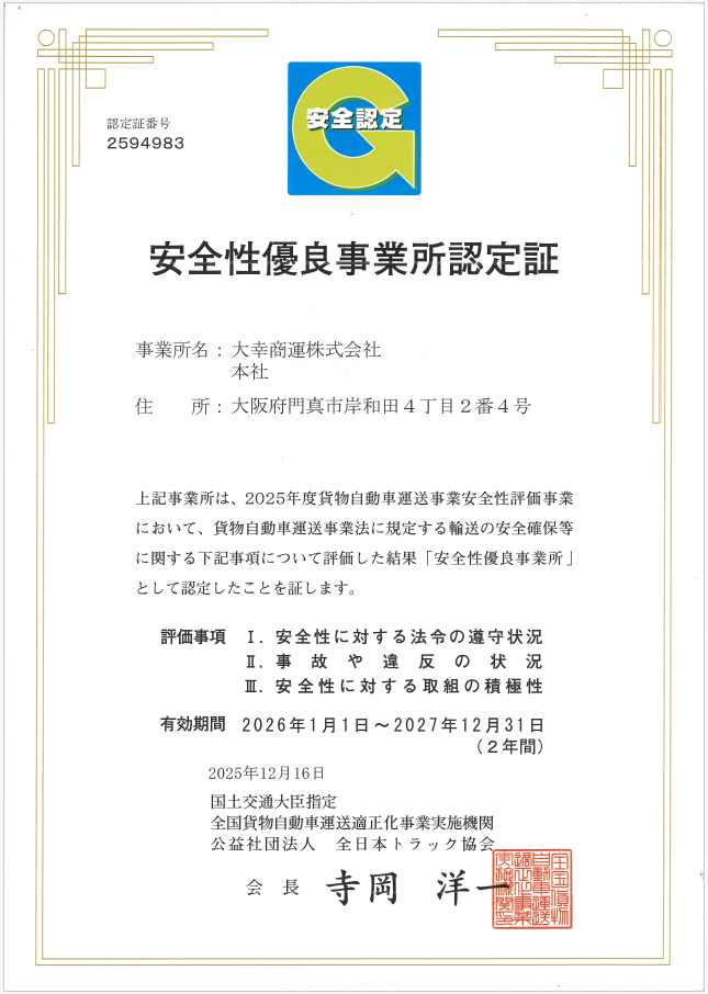 | 2025年12月16日 | 安全性優良事業所認定(Gマーク) 取得 (大幸商運株式会社、大幸物流株式会社) |